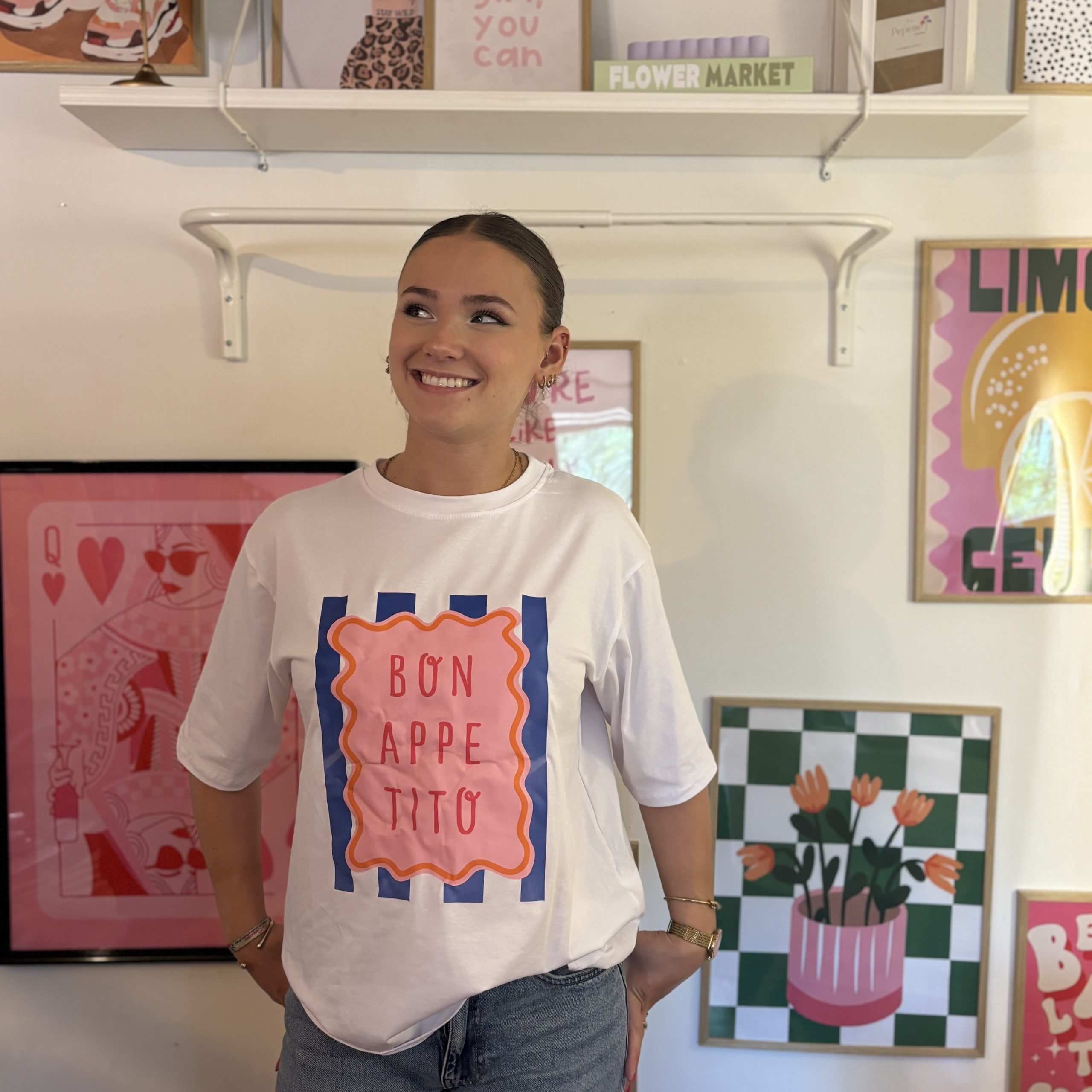 Le motif “Bon Appetito” ajoute une touche de fantaisie à vos tenues du quotidien. À porter seul ou sous une veste pour un look casual-chic, ce T-shirt deviendra vite un indispensable de votre dressing.